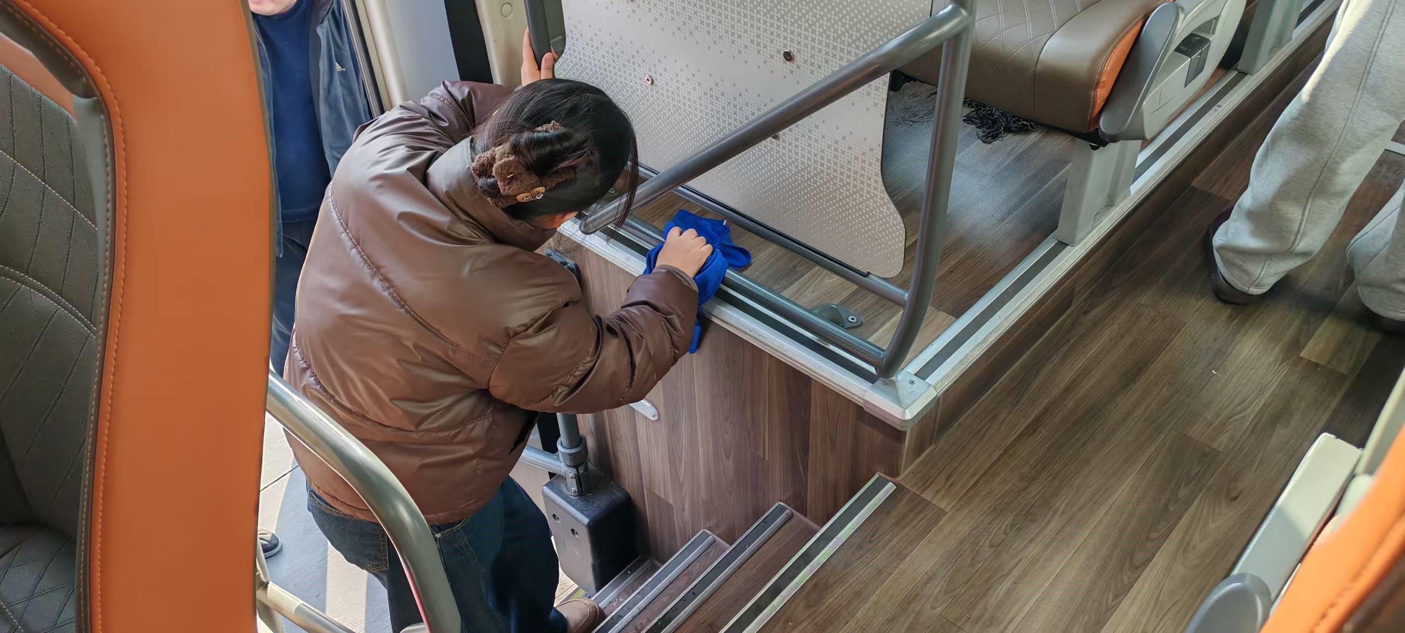 活动中,党员们亮身份、作表率,密切配合,分工协作:除去行李架边角积尘,清理座椅缝隙杂物,拖洗车厢过道地板,逐片擦拭车窗玻璃,深度清洁卫生死角和盲区......冬日清晨气温偏低,但服务热忱丝毫不减,团队全程以“毫米级”精细标准深度作业,打造安全舒适、整洁明净的乘车空间。